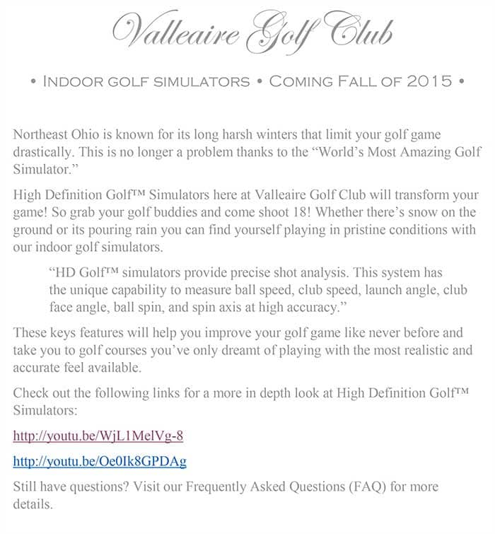 Permanent Tee Times for Indoor Golf taken now! Call 440.237.9191 x1 Rates per hour: $36 $9 per 1/4 hour of playMonday-Saturday: 9am – 9pmSunday: 8am – 4pm View Flyer